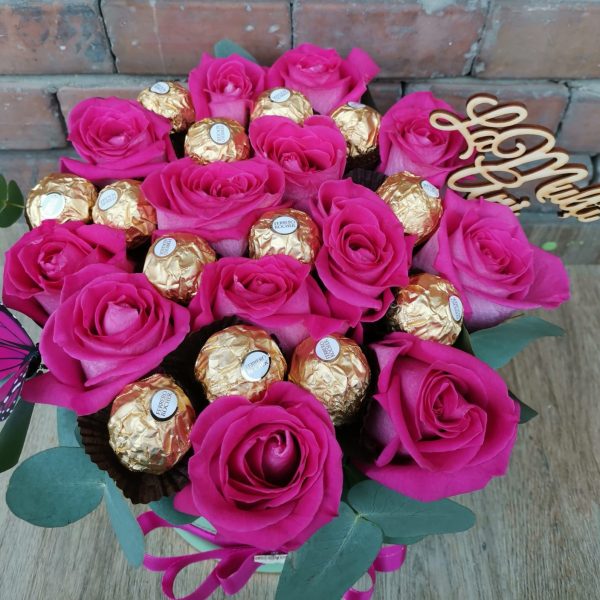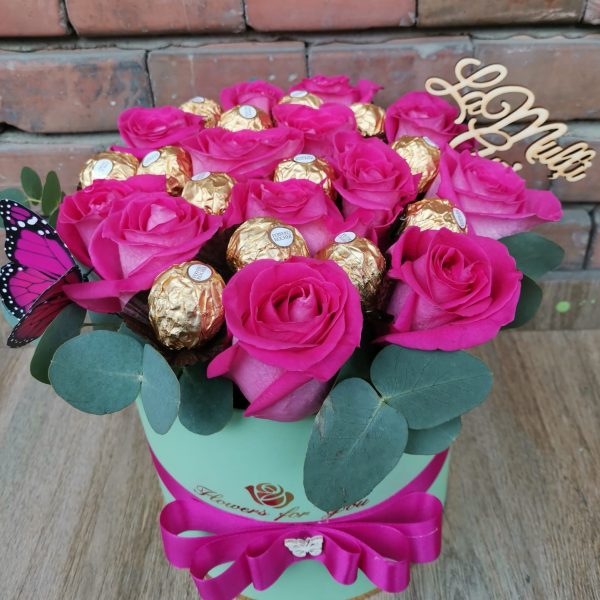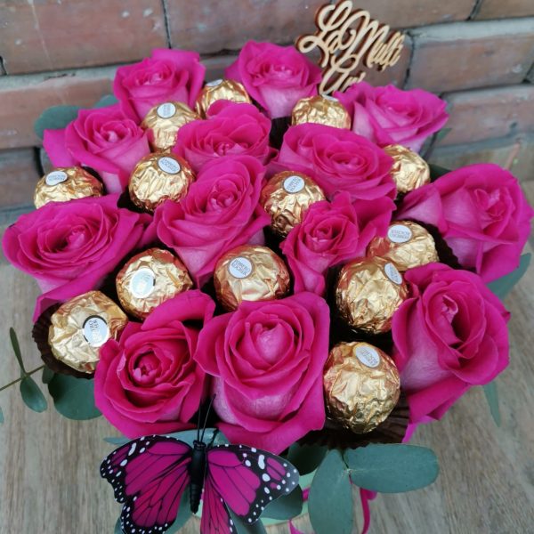 Aranjamentul floral in cutie contine 13 Trandafiri, 13 Praline, Eucalipt si fluturas